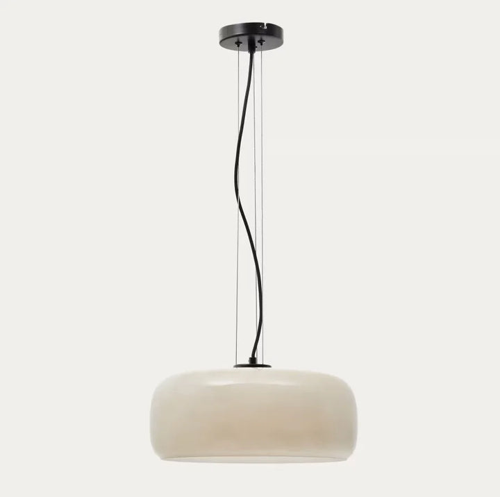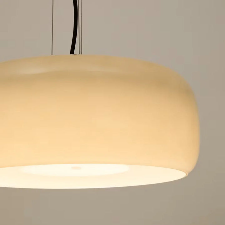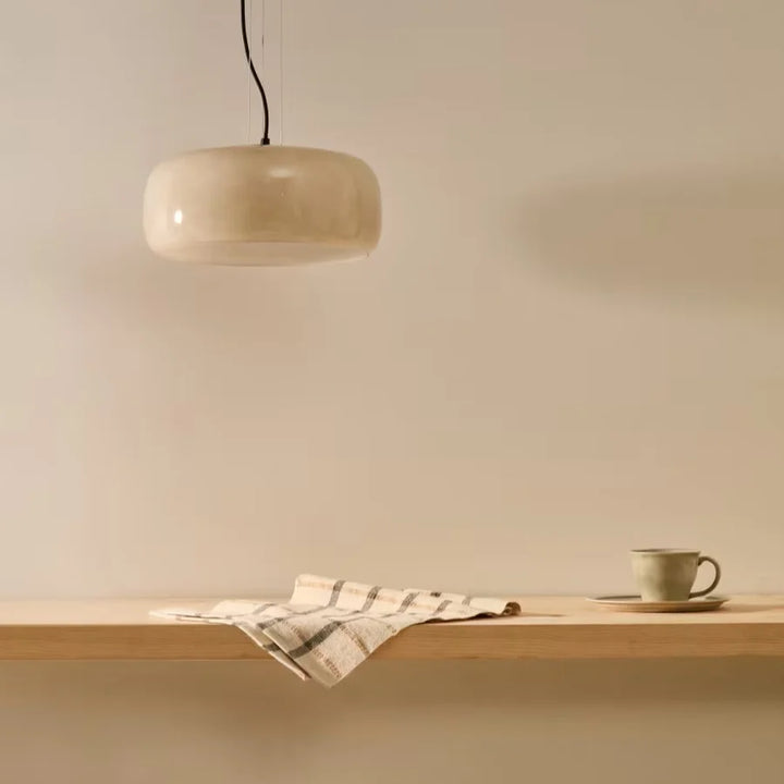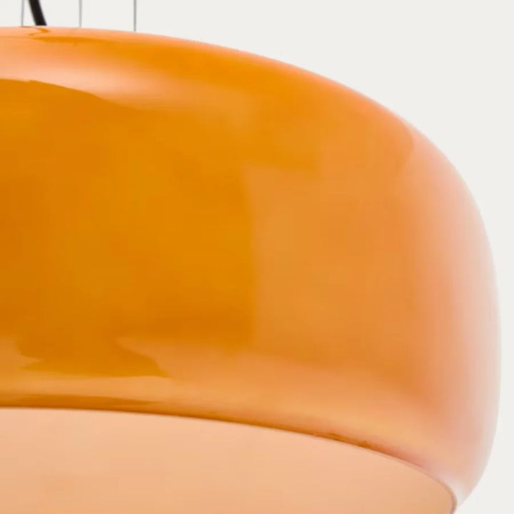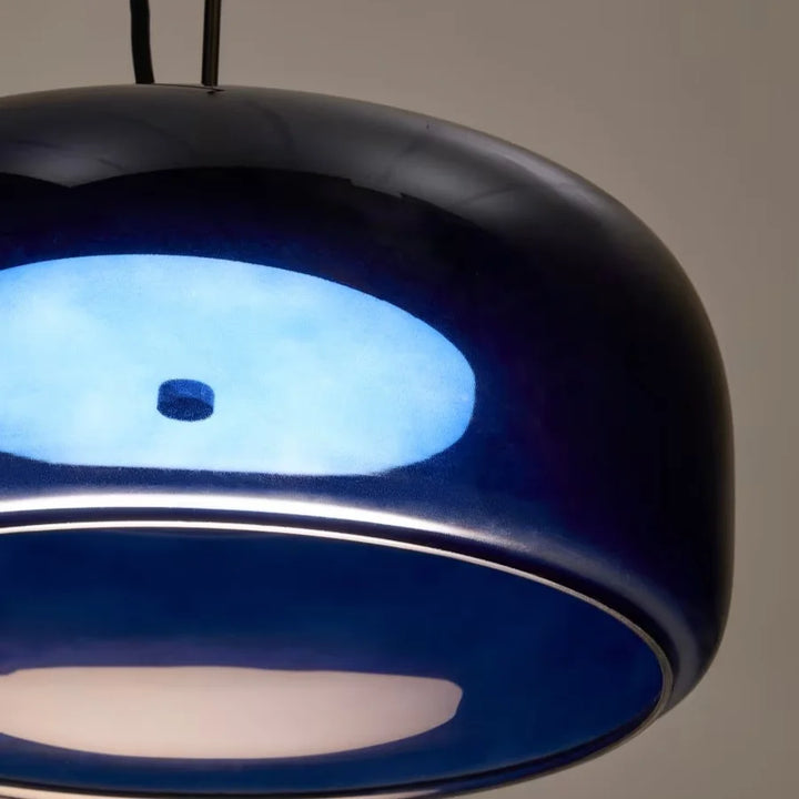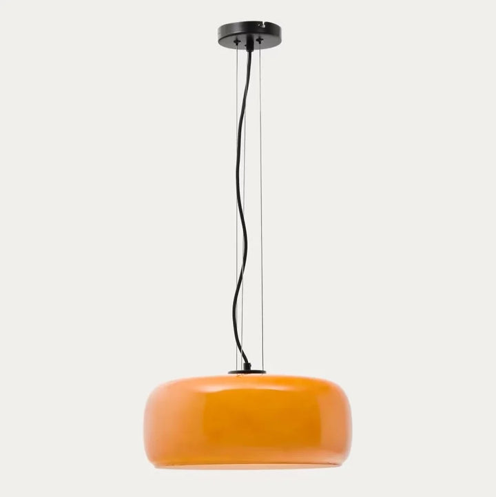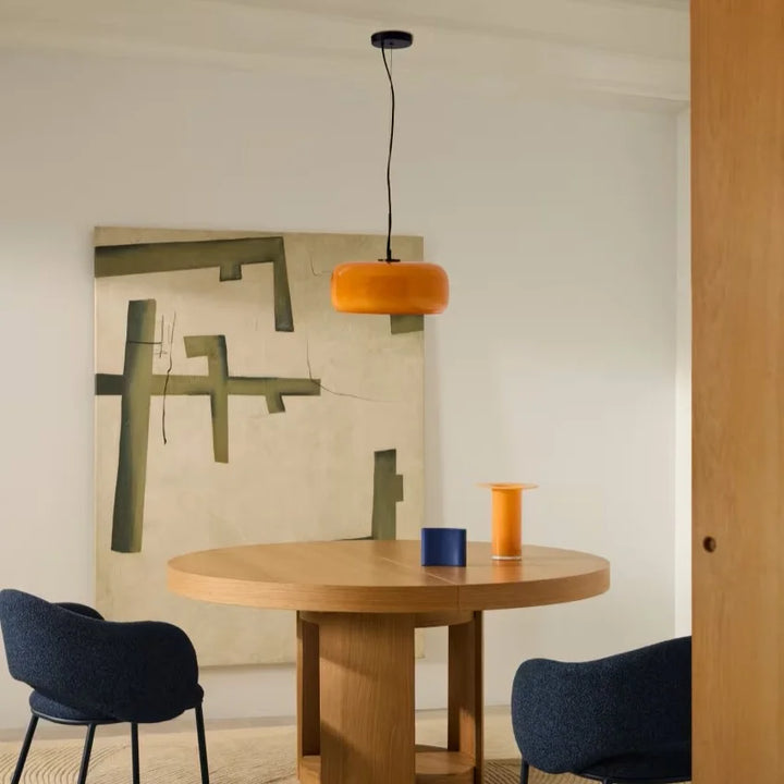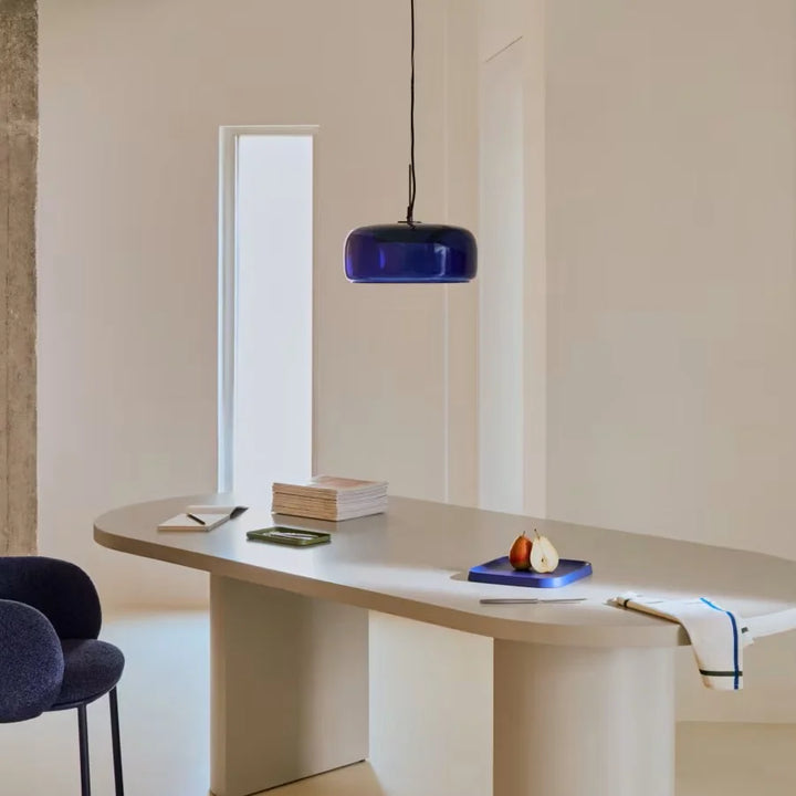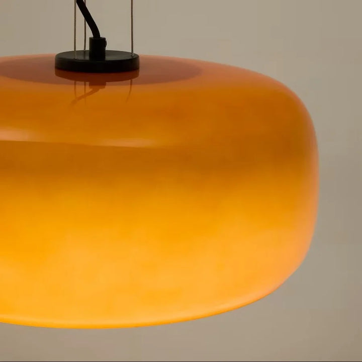 Inspired by the Sixties, this pendant lamp features a sleek shape that illuminates your space with a soft glow. When the lampshade is switched on, the glass subtly changes color, creating a vibrant palette of tones.