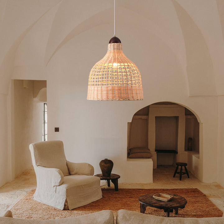 The Alfhild Japandi Basket Rattan Pendant Light is a perfect blend of Scandinavian and Japanese design aesthetics, offering a warm and inviting ambiance to any interior space. Crafted with natural rattan material, this pendant light showcases intricate handwoven patterns and a classic lantern shape, making it a statement piece for modern and minimalist homes.